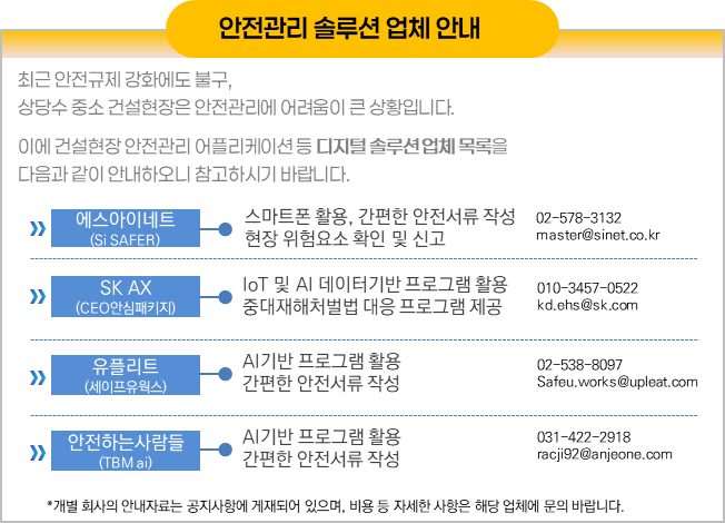 이에 우리협회는 중소업체의 효율적이고 원활한 안전관리 업무 지원을 위해 안전관리 어플리케이션 등 솔루션을 제공하는 업체를 다음과 같이 안내하오니 관심있는 회원사는 붙임의 소개자료를 참고하여 해당업체에 개별 문의하시기 바랍니다.